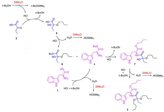 According to these results, a reaction mechanism that follows a series of sequential steps was proposed (Scheme 3). First, the formation of hemiacetal 5 is carried out, which is kinetically favored, as it is a poorly hindered 2-ketocarboxylic acid-type precursor with a high electrophilic character in the ketonic carbon. The presence of SiMe3Cl tends to cause the loss of a water molecule. However, as 1-butanol is not very nucleophilic, the acetal formation is not initially favored. In the second step, the esterification reaction of both ʟ-tryptophan 1 and intermediate 5 occurs, forming compounds 4 and 6, respectively. Subsequently, intermediates 4 and 6 react through an amidation reaction, forming an intermediate 7, which finally reacts with 1-butanol, towards the formation of compound 3. The presence of SiMe3Cl is decisive in the reaction since it favors the elimination of water from the medium in crucial steps [33,34], presumably participating in the final formation of 3 since, as proposed by Izumi, it first reacts with alcohols or carboxylic acids to form HCl, which is probably the definitive catalyst for these reaction systems, in addition to trapping water and thus selectively promoting these dehydration reactions when used in excess.