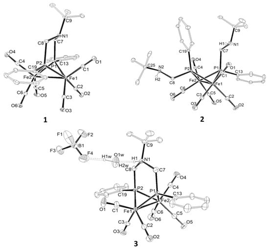 All the experiments were carried out under an inert atmosphere, using Schlenk techniques for the syntheses. Solvents were deoxygenated and dried according to standard procedures. A literature method was used for the preparation of the starting compound [Fe2(CO)6(μ-PHPh)2] [47] and tBuN(CH2Cl)2 [48]. All other reagents were commercially available and used as purchased. NMR spectra (1H, 31P-{1H}) were recorded at room temperature with Bruker AMX 400 or AC 300 spectrometers (Bruker, Billerica, MA, USA) of the “Service général des plateformes, Université de Bretagne Occidentale, Brest” and were referenced to SiMe4 (1H) and H3PO4 (31P). The infrared spectra were recorded with Bruker Vertex 70 and FT IR Perkin Elmer spectrum 2 spectrometer (PerkinElmer Inc., Waltham, MA, USA). Crystal data of compounds 1–3 were collected with an Oxford Diffraction X—Calibur −2 CCD diffractometer (Agilent Technologies Inc., Santa Clara, CA, USA), equipped with a jet cooler device and graphite-monochromated Mo-Kα radiation (λ = 0.71073 Å). The structures were solved and refined using standard procedures [49]. Deposition numbers CCDC 2330851, 2330852 and 2330853 contain the supplementary crystallographic data for 1, 2 and 3. These data can also be obtained free of charge from the Cambridge Crystallographic Data Centre via www.ccdc.cam.ac.uk/data_request/cif (accessed on 4 February 2024).