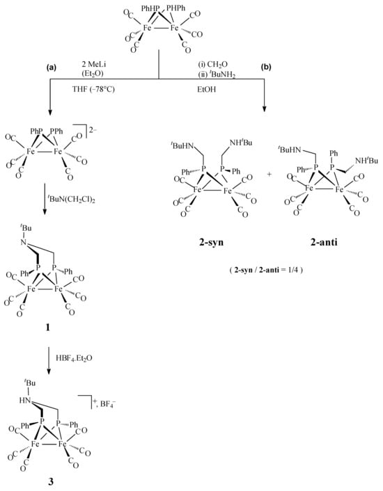 The complex [Fe2(CO)6(µ-{P(Ph)CH2}2NtBu)] (1) was obtained from the reaction of tBuN(CH2Cl)2 with the dianion [Fe2(CO)6(µ-PPh)2]2− (Scheme 2, path (a)). This latter dianion was prepared by the reaction of [Fe2(CO)6(µ-PHPh)2] with two equivalents of methyllithium [21,31,41]. In the presence of 1 equivalent of HBF4, Et2O, the protonation of 1 occurred at the nitrogen atom of the azadiphosphido bridge, which produced the cationic complex [Fe2(CO)6(µ-{P(Ph)CH2}2NHtBu)](BF4) (3). Attempts to prepare 1 through a one-pot reaction following a click process were also performed (Scheme 2, path (b)). The two isomers 2-anti and 2-syn were isolated by reacting a solution of the complex [Fe2(CO)6(µ-PHPh)2] in ethanol with an aqueous solution of CH2O, followed by the addition of tBuNH2. Compounds 1–3 were characterized by spectroscopic analyses (IR, NMR), and their structures were confirmed by X-ray analyses of single crystals (see Appendix A and Tables S1–S3). The strong bands observed at 2053, 2013, 1984 and 1970 cm−1 in the carbonyl region of the infrared spectrum of a CH2Cl2 solution of 1 are typical of hexacarbonyl diiron (FeIFeI) complexes with a diphosphido bridge [11]. The protonation at the amine function in 1, giving the ammonium species 3, is revealed by a shift of ca 12 cm−1 (average) of the ν(CO) bands at higher wavenumbers compared to those of 1, which is typical of a protonation in the second sphere of coordination of the di-iron centre. It is worth noting that few examples of isolated N-protonated forms of thiolato analogues have been reported [2,5]. The IR spectra of 2-syn/anti are similar to that of 1. The 1H NMR spectrum of 1 in CDCl3 exhibits the expected set of resonances for the aza-diphosphido bridge {P(Ph)CH2}2NtBu} according to a symmetrical molecule. Similar signals were observed in the 1H NMR spectrum of 3 in CD3CN, but shifted at higher chemical shifts due to its cationic nature. The proton of the ammonium group could not be observed. The 1H NMR spectra of 2-syn/anti in CDCl3 differ from those of 1 and 3 in the tBu/CH2/C6H5 ratio, which shows that there are two tBu groups instead of one. In the case of the syn isomer, a singlet is observed for the tBu groups, while the 1H NMR spectrum of the anti isomer displays two inequivalent singlets. Symmetrical species 1, 2-syn, 3 present in their 31P-{1H} NMR spectra a singlet above 110 ppm. Interestingly, in the case of the 2-anti species, an AB pattern with a coupling constant of 130 Hz was detected at 147.7 ppm. These chemical shifts are in the range of those observed when phosphido groups bridge two metal centres connected by a metal–metal interaction [46].