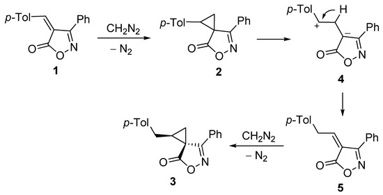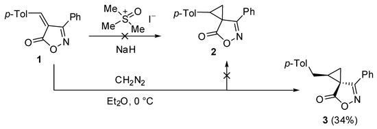 In our previous works, we have used different isoxazole derivatives as starting materials for the synthesis of nitrogen heterocycles [15,16,17,18]. In search of new isoxazole substrates, we became interested in isoxazol-5-ones spiro-fused with a cyclopropane ring. Such compounds could be prepared by the cyclopropanation of the C=C bond of 4-benzylideneisoxazol-5-ones. In this work, we report that the reaction of 4-(4-methylbenzylidene)-3-phenylisoxazol-5-one with diazomethane proceeds as a double methylene transfer, affording a benzyl-substituted cyclopropane spiro-fused with isoxazol-5-one. Note that examples of the double methylene transfer are rarely found in the literature [19,20,21,22], and, to the best of our knowledge, have never been observed in the cyclopropane formation.