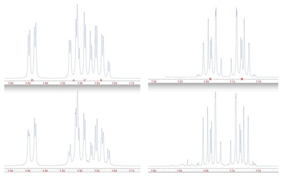 The 1H NMR spectrum of 3, described in the literature simply as δ 7.37 (m) [], showed an interesting and complex pattern (Figure 1). However, this was successfully simulated using the chemical shift values given in Table 1 and the coupling constants in Table 2 (Figure 1). The more symmetrical but still complex pattern in the 1H NMR spectrum of 1, described in the only literature report [] as δ 7.14 (AA′BB′), was likewise simulated (Figure 1) with values given in Table 1 and Table 2.