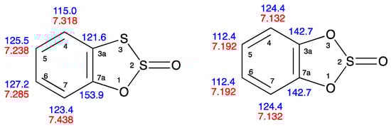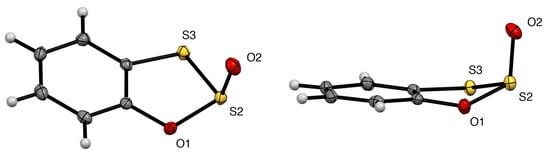 The structure of the oxygen analogue, catechol sulfite 1, has, however, been determined in the gas phase by electron diffraction [] and the structural parameters for the two compounds are compared in Table 3. Interestingly, the structure of 1 also features the “axial” S-oxide oxygen and a similar envelope conformation in the heterocyclic ring (Figure 4), although the flap angle in the case of 1 is significantly lower at 19.8(18)°. The other differences between 1 and 3 are rather predictable with a much lower internal ring angle and longer bonds to the ring S(3) as compared to ring O(3). The similar compound catechol sulfate 6 has been characterised twice by X-ray diffraction [,], and its structural parameters are also included in Table 3 for comparison. Again, in both structures, there is an envelope conformation with a lower flap angle of 14–15°.