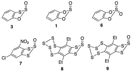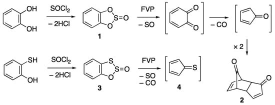 The simple compound benzo[d][1,3,2]dioxathiole 2-oxide or “catechol sulfite” 1 was first reported in 1894 []. It shows a rather interesting pattern of reactivity upon pyrolysis (Scheme 1), undergoing sequential loss of sulfur monoxide and carbon monoxide to generate cyclopentadienone, isolated as its stable Diels–Alder dimer 2 [], and this reaction has been developed into a convenient undergraduate laboratory experiment to illustrate the use of flash vacuum pyrolysis (FVP) []. The corresponding sulfur analogue benzo[d][1,2,3]oxadithiole 2-oxide 3 has only been mentioned in a single paper [], where its gas phase pyrolysis was used to generate cyclopentadienethione 4, detected by photoelectron spectroscopy, but no stable product was isolated in this case.