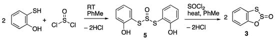 Although the original preparation of 1 involved simply heating catechol with thionyl chloride in benzene solution [], more recent reports have involved addition of pyridine and use of the highly toxic carbon disulfide as solvent [], and this was the method used in the preparation of 3 [], with the additional use of carbon tetrachloride. As we already reported for 1, simply heating catechol and thionyl chloride in toluene until the evolution of HCl ceased offered a much safer alternative [], and the application of the same method to the synthesis of 3 proved to be quite satisfactory. The reaction took an interesting course, however. Upon the addition of one equivalent of thionyl chloride to a toluene solution of 2-mercaptophenol (2-hydroxythiophenol) at room temperature, a vigorous exothermic reaction occurred with evolution of HCl, and a white solid was deposited. We interpret this as an attack of the more nucleophilic thiophenol function on thionyl chloride to give the dithiosulfite 5 (Scheme 2). Upon heating under reflux, the solid dissolved and a comproportionation reaction took place with the second equivalent of thionyl chloride to afford compound 3 in good yield.