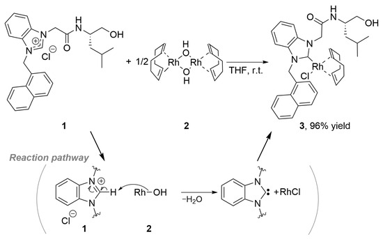 Over the past two decades, N-heterocyclic carbenes (NHCs) have garnered significant attention as ligands for transition metals, since the decisive breakthrough was achieved in 1991 by Arduengo III et al. [1,2,3,4,5,6]. Typically derived from azolium salts through deprotonation, NHCs have been instrumental in the synthesis of complexes like [RhX(cod)(NHC)] (cod = η2,η2-1,5-cyclooctadiene, X = halogen), which are commonly prepared via one of two routes [7,8,9]. The first route involves the reaction of in situ-generated free carbenes with [RhX(cod)]2, achieved through deprotonation using strong bases like KOtBu or potassium hexamethyldisilazide (KHMDS) [10,11]. This route requires thoroughly drying solvents and reagents and using an inert atmosphere. Herrmann et al. showed that the treatment of 1,3-dibenzylimidazolium bromide with [RhCl(cod)]2 under the influence of K2CO3 at 70 °C for 20 h in water produced the corresponding [RhCl(cod)(NHC)] complex in almost quantitative yield [12]. The second route entails using a carbene transfer agent, the [AgX(NHC)] complex, derived from direct reactions of an azolium halide with Ag2O [13,14]. However, this approach adds an extra synthetic step and risks contaminating the final product with unwanted silver, rendering both approaches multi-step and economically unfavorable.