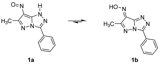 Previously, we have shown [12] that the nitrosation of 1H-6-methyl-3-phenylpyrazolo [5,1-c][1,2,4]triazole leads to the nitroso derivative (1a), which is as stable as its tautomer 1H-7-hydroxyimino-6-methyl-3-phenylpyrazolo[5,1-c][1,2,4]triazole (1b), as seen below in Scheme 1.