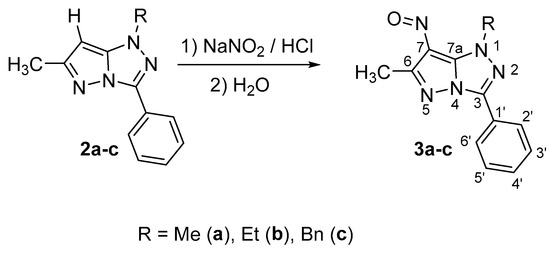 The nitrosation of 1H-1-alkyl-3-phenyl-6-methylpyrazolo[5,1-c][1,2,4]triazoles (2a–c) was performed in a similar way to the nitrosation of 1H-6-methyl-3-phenylpyrazolo[5,1-c][1,2,4]triazole [12], using sodium nitrite in aqueous hydrochloric acid, as seen below in Scheme 2.