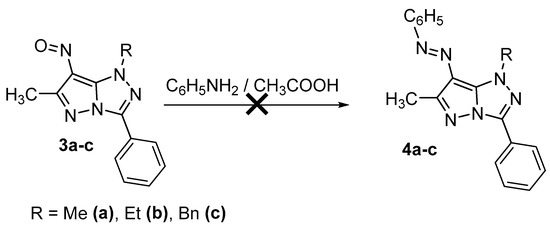 However, compounds 3a–c do not exhibit one of the characteristic reactions of the N=O group grafted onto an aromatic heterocycle, namely condensation with aniline in an acetic acid medium at reflux (Scheme 3), a reaction that is shown in the literature for nitrosopyrazoles [14].