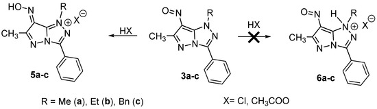 1H-1-alkyl-7-hydroxyimino-6-methyl-3-phenylpyrazolo[5,1-c][1,2,4]triazolium salt (5a–c) formation.