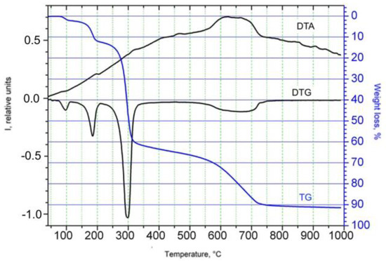 Using the method of thermogravimetric analysis (TGA), it was established that thermolysis of the complex begins in the range of 80–210 °C (Figure 1). In this temperature range (peak 180 °C, weight losses Δm = 13.5%) of the complex, one molecule of solvated 2-propanol is removed from the gas phase (calc. Δm = 13.8%). At a higher temperature, the compound undergoes oxidative thermal decomposition of the organic part of its molecule, which is accompanied by several exothermic peaks and a significant loss of mass. The final product of thermolysis is nickel(II) oxide.