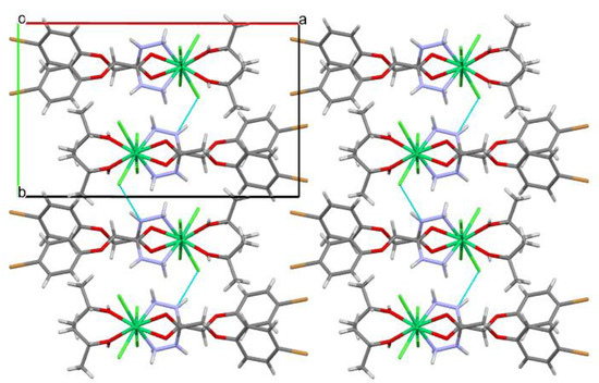 In the crystal phase, the complex under study forms a polymeric chain in the [001] crystallographic direction, in which the Cl1 anion acts as a bridge between nickel cations (Figure 3). Ligands within a chain are bound additionally by the O3–H3…Cl2′ (the symmetry operation is x, 1.5 − y, 0.5 + z; the H…Cl distance is 2.26 Å, and the O–H…Cl angle is 158°) and N1–H1A…Cl2′ (the symmetry operation is x, 1.5 − y, 0.5 + z; the H…Cl distance is 2.73 Å, and the N–H…Cl angle is 138°) hydrogen bonds. The N2–H2...Cl2′ hydrogen bonds (the symmetry operation is 1 − x, −1/2 + y, 1.5 − z; the H…Cl distance is 2.49 Å; the N–H…Cl angle is 149°) are found between neighboring chains forming layers parallel to the (100) crystallographic plane (Figure 4).