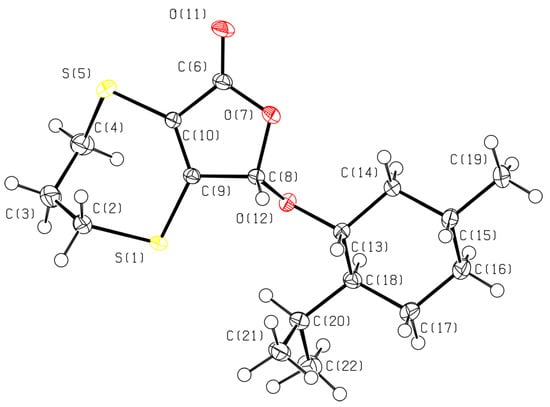 The structure of compound 2 was solved in the chiral space group P212121, and the asymmetric unit contains a single crystallographically independent molecule (Z′ = 1). According to the X-ray data, the five-membered ring is planar. The seven-membered cycle of 2 in the crystal assumes a “twist” conformation: the S(1)C(9)C(10)S(5) fragment, containing a double bond C(9)=C(10) and the sulfur atoms adjacent to it, is planar. The C(3) atom lies in the same plane, and the C(2) and C(4) atoms are spaced at equal distances on the opposite sides of this plane. The X-ray diffraction data confirm the absolute configuration of the menthyl group and the specified (S)-configuration of the asymmetric carbon atom C(8) of the lactone ring in the crystal. The absolute configuration of the chiral centers has been determined from the anomalous scattering of the heavy sulfur atoms.