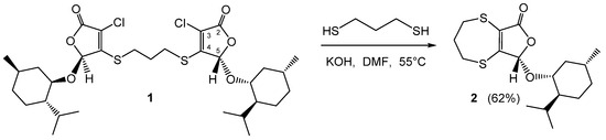 We assumed that the interaction of compound 1 with dithiol in the presence of a base would lead to the formation of the product of the nucleophilic substitution of both chlorine atoms at position 3 of two lactone rings in molecule 1 by the propane-1,3-dithiol fragment. However, the reaction of bis-thioether 1 with propane-1,3-dithiol carried out in DMF in the presence of potassium hydroxide resulted in the formation of the novel chiral bicyclic sulfur-containing compound 2 in a yield of 62% (Scheme 1). The same fused heterocycle 2 was isolated in a similar yield (58%) using high dilution conditions with the slow addition of reactants and cesium carbonate as a base, although in this case the reaction required more prolonged heating in DMF at 55 °C.