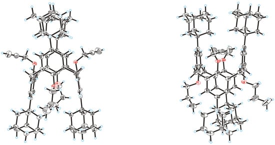 Upon slow evaporation of a dichloromethane/methanol solution of calixarene 3, single crystals were collected and subjected to X-ray diffraction analysis. The obtained data confirmed unambiguously the structure of this compound having the 1,3-alternate shape and bearing pairs of the alternating n-propyl and propargyl groups attached to the adamantylated macrocycle (Figure 1).