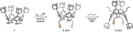 Synthesis of adamantylated calix[4]arene 3 bearing pairs of n-propyl and propargyl groups at the opposed sides of the 1,3-alternate macrocycle.