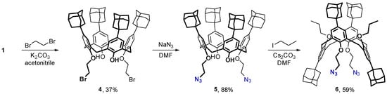 Synthesis of adamantylated calix[4]arene 6 bearing pairs of n-propyl and 2-azidoethyl groups.