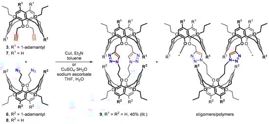 We have recently shown that the 1,3-alternate calix[4]arene bis(alkyne) 7 and bis(azide) 8, both having no substituents in the p-positions of the calixarene macrocycles, can be readily assembled under the Cu+-catalysis into a semi-tubular biscalixarene 9 (Scheme 3). This compound, in which two triazole groups played both the linker and the receptor functions simultaneously, has been prepared in relatively high yield for such a two-fold reaction using CuI/Et3N or, better, CuSO4·5H2O/sodium ascorbate catalytic systems. Polymeric/oligomeric substances were the only by-products detected in the reaction mixtures, thus indicating a complete conversion of the starting calixarenes 7 and 8 [].