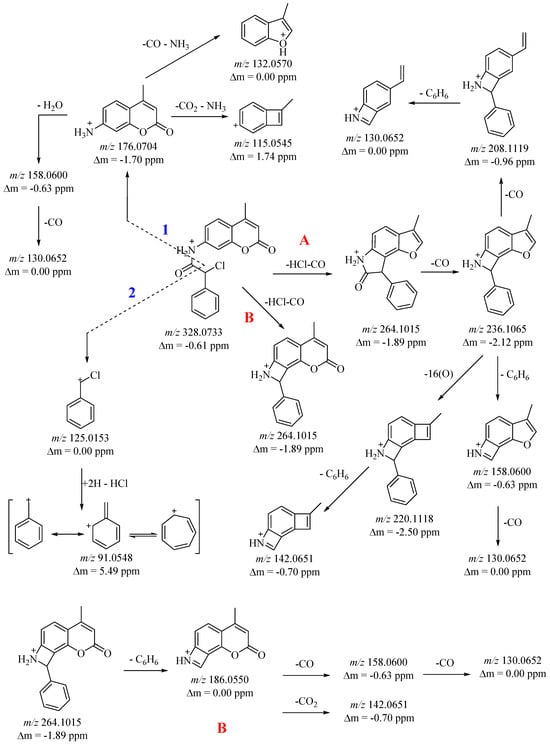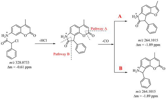 3, three fragmentation mechanisms of the molecular ion are discerned. One involves the cleavage of neutral molecules HCl, CO, and a phenyl fragment from the molecular ion (pathway A and B), while the other two mechanisms entail the cleavage of the NH–C(O)–C(Cl) group, yielding characteristic coumarin and chloro(phenyl)methylium ions (refer to