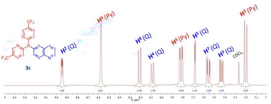 All the compounds obtained were characterized by NMR and IR spectroscopies and mass spectrometry. The signals in 1H NMR spectra of the products can be easily attributed to the protons in the structure basing on their chemical shifts, coupling constants and relative integral values. A typical 1H NMR spectrum (compound 3c) is shown in Figure 1, and the full spectra of the products are given in the Supplementary Materials.