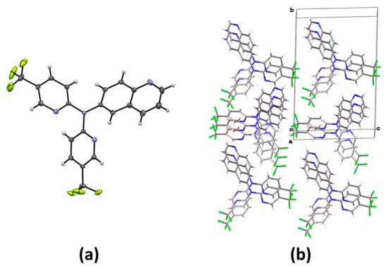 For product 3c, a crystal of satisfactory quality was obtained, and its structure was additionally proved by X-ray analysis (Figure 2a). Product 3c forms crystals of a monoclinic system with P21 symmetry. In the crystal, molecules are assembled by parallel displaced π-π interactions between the quinolinyl moieties (Figure 2b). The resulting stacks passing along the a axis are grafted together by several C-H-π contacts, forming thick layers in the 0ab plane. The layers are packed along the c axis by van der Waals interactions.