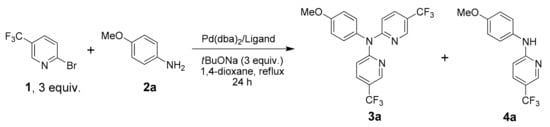Diarylation of p-anisidine 2a with 2-bromo-5-(trifluoromethyl)pyridine 1 was studied as a model reaction (Scheme 1). The reaction was performed under an argon atmosphere in boiling 1,4-dioxane in the presence of sodium tert-butoxide as a base, three equivalents of 1 were taken. The progress of the reaction and the yields of the product were monitored by 1H NMR spectroscopy using internal standard.