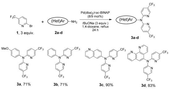 In the next step, we undertook the synthesis of a representative series of bis(5-(trifluoromethyl)pyridin-2-yl)amine-based ligands 3b–d under optimized conditions (Scheme 2). The N-phenyl derivative 3b was obtained in a 71% yield, while quinoline- and 1,10-phenanthroline-based ditopic ligands 3c and 3d were afforded in very good yields (90 and 83%, respectively). The obtained yields are superior to those previously reported for a similar reaction, which gives a 40% yield and proceeds under more stringent conditions (120 microwave reactor, sealed ampoule), which limits its scaling. Thus, the procedure can be applied for the synthesis of various ligands from corresponding amino substituted arenes and heteroarenes.