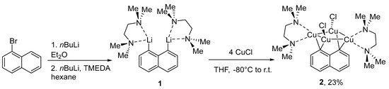 - Eriksson, H.; Håkansson, M. Mesitylcopper: Tetrameric and Pentameric. Organometallics 1997, 16, 4243–4244. [Google Scholar] [CrossRef]