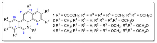 - Han, N.; Yang, Z.; Liu, Z.; Liu, H.; Yin, J. Research Progress on Natural Benzophenanthridine Alkaloids and Their Pharmacological Functions: A Review. Nat. Prod. Commun. 2016, 11, 1934578X1601100838. [Google Scholar] [CrossRef]