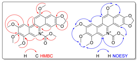 Comparison of the 1H and 13C NMR data (Table 1) with the literature values indicated a similarity to chelerythrine-like quaternary benzo[c]phenanthridiniums salts [22]. However, compound 1 differed from reported type-III benzophenanthridines in the 1H NMR spectrum by four singlets at δH 3.99, 3.88, 3.82, and 3.80, corresponding to the methoxy groups at C-9, C-7, C-12, and C-8, respectively. A singlet at δH 3.68 was attributed to the methoxycarbonyl group at N-5. The aromatic region displayed signals of an ortho-disubstituted benzomethylenedioxy ring system, with two singlets at δH 7.76 and 7.45, corresponding to protons at positions 1 and 4, respectively. Two singlets at δH 7.17 and 6.99 were also observed, assigned to the protons at positions C-11 and C-10. A downfield singlet at δH 9.77 confirmed the presence of a hydrogen H-6 near the quaternary ammonium ion at N-5. The 13C NMR spectrum provided further structural insights into this novel benzophenanthridinium. The spectrum revealed carbon signals for the above-mentioned methoxy groups at δC 56.6, 60.3, 55.9, and 59.8, and the carbonyl carbon at δC 154.8. Signals for aromatic carbons were observed in the range of δC 100 to 157 ppm, with the characteristic signals for the benzomethylenedioxy ring carbons. The methine C-6 appeared at δC 144.9, consistent with the downfield shielding effect of the iminium group. No correlations were observed in the 1H-1H COSY, and the HMQC experiment (Figure S3) demonstrated connectivity between hydrogens and the respective carbons (Table 1).