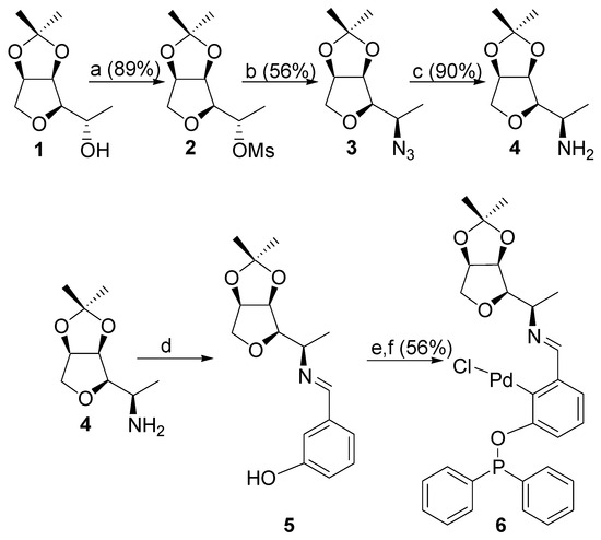 Starting from commercially available isosorbide, the synthesis of the targeted chiral PCN pincer palladium(II) Complex 6 was carried out in eight steps. The first three steps involved the preparation of the bicyclic Alcohol 1 according to our previous reports [21,22,23]. Next, mesylation of (S)-alcohol 1 yielded (S)-mesylate 2, which, after treatment with an excess sodium azide, afforded the corresponding (R)-azide 3 as a single stereoisomer. Slight hydrogenation of the latter led to the desired (R)-amine 4 (Scheme 1).