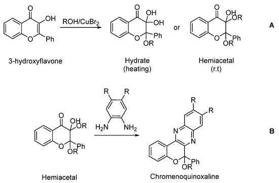The reaction of 3-hydroxyflavone with alcohols in the presence of copper(II) bromide to produce chromane hydrates and hemiacetals (A). The reaction of chromane hemiacetals with o-phenylenediamine derivatives to produce chromenoquinoxalines (B).