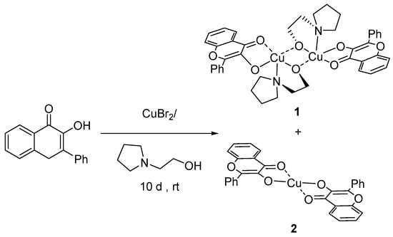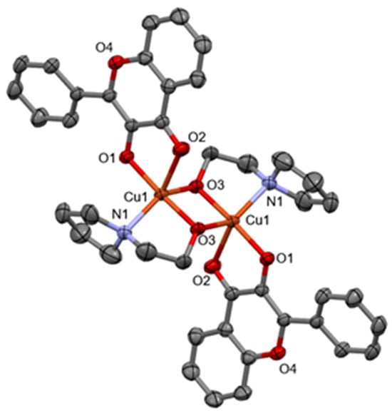To better understand the scope of 3-hydroxyflavone with substituted alcohols possessing electron-donating groups under oxidative conditions, 3-hydroxyflavone was reacted with 2-(1H-pyrrol-1-yl)ethanol in the presence of an equivalent of copper(II) bromide under neat conditions (Figure 2). The reaction was stirred for 10 days at room temperature to yield a viscous pale-green slurry. It had been previously discovered that long reaction times are required to oxidize 3-hydroxyflavone to the hemiacetal or geminal diol chromanes []. Notably, the reaction appeared significantly different in color from those previously performed in methanol, ethanol, and isopropanol, which produced dark, brownish-colored solutions. After filtering the solution from suspected copper coordination compounds and salts, a viscous clear mass was isolated in low yield. 1H NMR analysis of the viscous residue revealed only starting materials. The insoluble solids trapped during the filtration process were extracted into chloroform. Slow evaporation of the solvent produced copious amounts of emerald-green plates and dark-bluish, block-like crystals with a metallic luster. The emerald-green crystals were ultimately determined to be a copper(II) dimeric complex with both 3-hydroxyflavonolate (flav) and 2-(pyrrolidin-1-yl)ethanoxide (2PEO = -O(CH2)2N(CH2CH2)2) ligands attached in a κ2-boding arrangement, [μ-O-(κ2-O,O-flav)(κ2-N,O-2PEO)Cu]2 (1) (Figure 2). The dark-bluish crystals were determined to be the previously reported bis(flavonolate) copper(II) complex, (flav)2Cu (2) [,].
