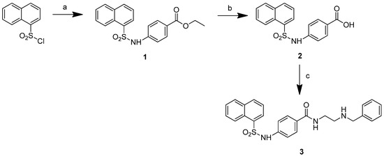 Scheme 1 reports the synthesis of the final compound 3. Commercially available α-naphthalene sulphonyl chloride was condensed with benzocaine [4]; then, the resulting ester 1 was hydrolysed in basic conditions giving the naphthalene-sulphonamide benzoic acid 2 [1]. The condensation between 2 and commercial N-benzyl-ethylenediamine in the presence of (2-(1H-benzotriazol-1-yl)-1,1,3,3-tetramethyluronium hexafluorophosphate (TBTU) and N-ethyl-diisopropylamine (DIEA) as condensing agents afforded the final compound 3 [5]. None of the steps required the use of column chromatography, resulting in cost and time savings.