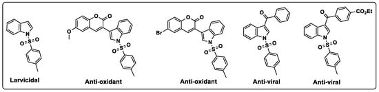 On the other hand, heterocyclic compounds are ubiquitous in pharmaceuticals, appearing in the majority of marketed drugs. Among these, indole derivatives are commonly used in a range array of pharmaceutical applications. This includes their use as anti-cancer [5], antioxidant [6], anti-microbial [7], and anti-viral agents [8]. Remarkably, the introduction of the tosyl group in the structure of indole has yielded numerous bioactive compounds with different activities such as larvicidal effects [9], antioxidant activity [10], and anti-viral activity [11] (Figure 1).