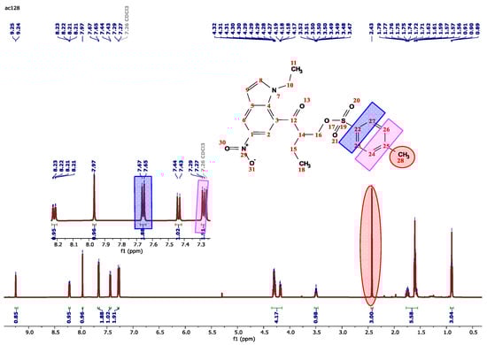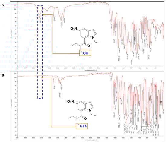 The structure of compound 5 was then structurally elucidated through spectroscopic techniques. By HRMS (Figure 2), its molecular formula was determined to be C22H24N2O6S, with a molecular ion peak at m/z 445.0154 [M+1]+. FTIR spectroscopy effectively monitored the conversion of the hydroxy group in compound 4 to the tosyl group in compound 5. In the IR spectrum of compound 4 (Figure 3A), the hydroxy group is indicated by a band at 3451.88 cm−1. This band is absent in the IR spectrum of compound 5 (Figure 3B), confirming the transformation. In the 1H NMR spectrum (Figure 4), the presence of eight aromatic protons appearing between 7.27 ppm and 9.29 ppm supports the structure of 5. Furthermore, the presence of a singlet peak in the aliphatic region with an integration of three protons corresponding to Ar-CH3 further demonstrates the presence of the tosyl group. As expected, the 13C NMR spectrum (Figure 5) indicates the presence of 20 carbons, which is in accordance with the structure of 5, since there are equivalent carbons in the tosyl group.