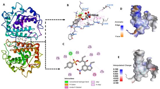 In order to investigate the possible antioxidant activity of compound 5, we used the crystal structure of tyrosinase from Bacillus megaterium (PDB ID: 3NM8), retrieved from the RSCB protein data bank (https://www.rcsb.org/). As illustrated in Table 1, the compound presented a docking score in the order of −10.86 Kca/mol which suggested that it could bind to tyrosinase spontaneously, indicating good protein ligand affinity. Enzymatic inhibition can theoretically occur through the ligand occupancy of the enzyme active site by non-covalent interactions [13]. Accordingly, compound 5 potentially possesses potent inhibition capacity as it effectively fits into the active site of tyrosinase and forms favorable interactions with its amino acid residues. This includes hydrogen bonds with Lys47, Π- alkyl, and alkyl–alkyl with Ala 44, Ala 40, Lys 47, Thr 267, Ile 139, and Phe 48 as well as an amide- Π stacking interaction with Ile 39, as shown in Figure 6B,C.