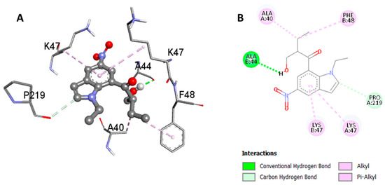 Three-dimensional (A) and two-dimensional (B) representations of interacting residues with compound 4.