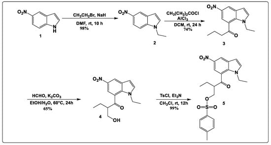 Our targeted compound was prepared according to the synthesis pathway in Scheme 1. The process of synthesis started with the N-alkylation of 5-nitroindazole (1) using the procedure reported by Bortolozzi, R. et al. [12] to give intermediate 2 in a very good yield (98%). This alkylation step was crucial for protecting the indole nitrogen from reacting with butyryl chloride in the subsequent step and for enhancing the hydrophobic interactions of the final compound with the target enzyme, thereby improving its binding affinity and overall activity. Next, intermediate 2 was acylated with butyryl chloride in the presence of aluminum chloride (AlCl3), affording intermediate 3 with a 74% yield. Thereafter, a condensation reaction using formaldehyde in the presence of potassium carbonate (K2CO3) was performed to yield 65% of compound 4. Lastly, the hydroxy group of 4 was easily tosylated under mild conditions using p-toluenesulfonyl chloride in the presence of triethylamine (Et3N) as a base in chloroform, leading to compound 5 in a very good yield (99%), as illustrated in Scheme 1.