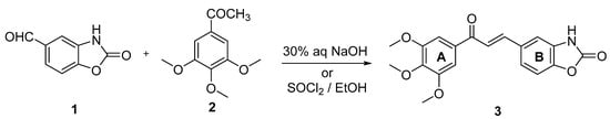 The synthesis of (E)-5-(3-oxo-3-(3,4,5-trimethoxyphenyl)prop-1-en-1-yl)benzo[d]oxazol-2(3H)-one (3) was performed by the Claisen–Schmidt condensation of 2-oxo-2,3-dihydrobenzo[d]oxazole-5-carbaldehyde (1) and 3,4,5-trimethoxyacetophenone (2) (Scheme 1). The aldehyde 1 was prepared in three steps, as previously described [17]. Briefly, 4-hydroxy-3-nitrobenzaldehyde protected as the 1,3-propanediol acetal was catalytically reduced to the corresponding aniline, cyclized with 1,1′-carbonyldiimidazole (CDI), and deprotected. The resulting aldehyde 1 was condensed with acetophenone 2 under acid- or base-catalyzed conditions. The acid-catalyzed condensation was performed using SOCl2/EtOH, as previously described [18]. The base-catalyzed reaction was carried out in ethanol/aqueous NaOH. Both reactions yielded a single product detectable by thin-layer chromatography. The yields were 85% and 89% for the base-catalyzed and acid-catalyzed reactions, respectively.