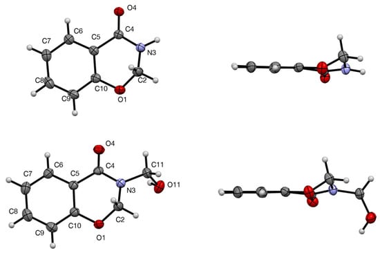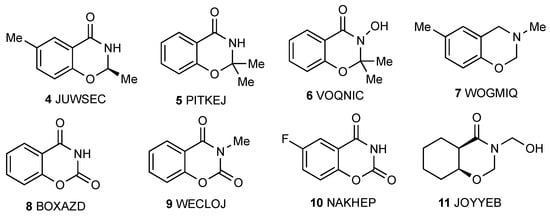 - Kashino, S.; Nakashima, S.; Haisa, M. The crystal and molecular structures of 2H-1,3-benzoxazine 2,4(3H)-dione (CSA) and 2H-3,1-benzoxazine 2,4(1H)-dione. Acta Crystallogr. Sect. B 1978, 34, 2191–2195. [Google Scholar] [CrossRef]