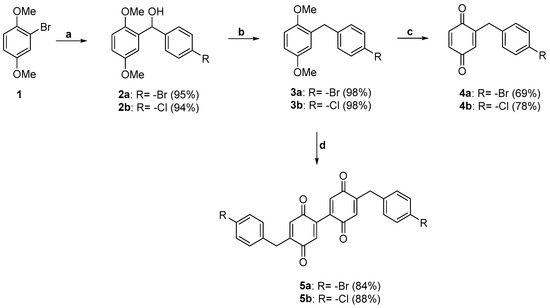 With the aim to easily enlarge the chemical diversity of the quinone-based compounds library, we planned to prepare quinones (4a and 4b) and diquinones (5a and 5b) from the same 2-(4-benzyl-substituted)-1,4-dimethoxybenzene starting material. As already reported in the literature, indeed, the manner by which the oxidation step with ceric ammonium nitrate (CAN) is carried out strongly affects the quinone/diquinone product ratios [15,16,23]. Therefore, in this study, we adopted different reaction protocols to enable the selective synthesis of quinones [23] or the corresponding diquinones [15], observing the effects of CAN oxidation when the 4-bromo- and 4-chlorobenzyl groups are bound to the 1,4-dimethoxybenzene moiety.