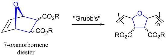- Novak, B.M.; Grubbs, R.H. The Ring-Opening Metathesis Polymerization of 7-Oxabicyclo[2.2.1]Hept-5-Ene Derivatives—A New Acyclic Polymeric Ionophore. J. Am. Chem. Soc. 1988, 110, 960–961. [Google Scholar] [CrossRef]