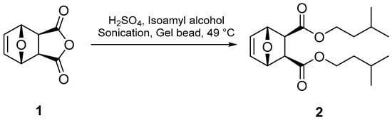 Compound 2 was prepared from a modified procedure (Figure 2) that called for the reaction of exo-7-oxabicyclo[2.2.1]hept-5-ene-2,3-dicarboxylic (1) with methanol under HCl catalysis and refluxing for two hours [13]. The reaction times were too excessive to accommodate the time allotted for laboratory classes [14]. Indeed, the Fisher Esterification reaction is hampered by its small equilibrium constant (keq = ~4); thus, several strategies have historically been employed to improve the yield of the ester product, which include increased reaction temperatures, use of a catalyst, conducting the reaction in excess alcohol, and the removal of water using a Dean–Stark apparatus or desiccants [15]. Notably, the condensation reaction rate retards with increasing steric bulk of the alcohol or carboxylic acid; therefore, forming compound 2 using this method would prove difficult. To overcome these deficiencies, we adopted sonication techniques [16] to exploit the properties of cavitation chemistry that have been theorized to produce microscopic zones of extreme temperatures and pressures [17]. In concert with sonication, super absorbent polymer beads (sodium polyacrylate beads, Jelly Marbles®) were used as a desiccant to drive the reaction to product formation. To our knowledge, this is the first use of these conditions in the Fisher Esterification reaction. Compound 2 was successfully prepared by reacting isoamyl alcohol with compound 1 and a catalytic amount of sulfuric acid in the presence of gel beads under sonication at 49 °C for 30 min (Figure 2). After workup, compound 2 was isolated as colorless thin crystals in ~20% yield. It should be noted that conducting the reaction under thermal conditions (no sonication) promoted the retro-Diels–Alder reaction to produce diisoamyl maleate and its hydrolyzed product, maleic acid. This decomposition becomes more problematic with temperatures above 50 °C. It should also be noted that methyl, ethyl, and isopropyl analogs of the 7-oxanorbornene diesters can be prepared using these standard conditions.