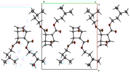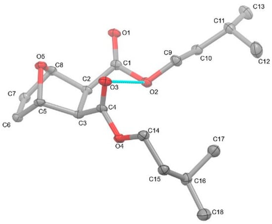 Compound 2 was examined by single-crystal X-ray diffraction (Figure 3). Crystal data for C18H28O5 (MW: 324.19 g/mol): monoclinic, space group P21/c (14) with cell values of a = 15.5647(3) Å, b = 12.8969(2), c = 9.0873(2) Å; β= 99.632(2)° V = 1798.44(6) Å3, Z = 4, T = 104.5 K, 0.521 × 0.275 × 0.08 (thickness, length, width reporting), μ(CuKα) = (λ = 1.54184 Å), Dcalc = 1.198 g/cm3, 18,491 reflections measured (5.76 ≤ 2Θ ≤ 139.618°), to 3363 unique (Rint = 0.0487, Rsigma = 0.0262), which were used in all calculations. The final R1 was 0.0494 (I > 2σ(I)) and wR2 was 0.1441 (all data). Despite the numerous reports of 7-oxanorbornene diesters, a perusal of the literature reveals a paucity of their structural reports [8,9,10,11,12,13,14,15,16,17,18,19,20,21]. More surprisingly, only the methyl version has been reported [18,19,20,21]. Thus, this structural report of compound 2 joins the somewhat rare cohort of structurally characterized compounds. The structure of compound 2 displays a bicyclic 7-oxanorbornene unit with protruding isoamyl groups that dominate the structure. The carbonyl groups are tilted in the same direction, causing the carbonyl oxygen atom (O3) to have close intramolecular contact (2.986 Å) with the O2 atom of the adjacent ester moiety. The tilting of the carbonyls is likely an artifact to lessen the intramolecular electronic interactions between the adjacent diesters’ oxygen atoms (O1···O3 = 3.416 Å and O2···O4 = 3.257 Å). This was also observed with the previously reported dimethyl 7-oxanorbornene diester [18,19,20,21]; however, the carbonyl oxygen atoms were a bit closer (O···O = 3.345 Å) as compared to compound 2. Moreover, the intramolecular contact between the carbonyl oxygen atom of one ester is farther away from the ester oxygen atom of the adjacent ester (3.133 Å) in the dimethyl version as compared to compound 2. Canonically, compound 2 would be expected to be a meso compound with Cs symmetry; however, the titling carbonyl groups and the different rotational conformations of the isoamyl groups in the single-crystal X-ray structure of compound 2 cause the molecule to be asymmetric. The bond distances and angles of compound 2 are typical and similar to previously known 7-oxanorbornene diesters and diacids [18,19,20,21]. A list of structural data is shown in Table 1.
