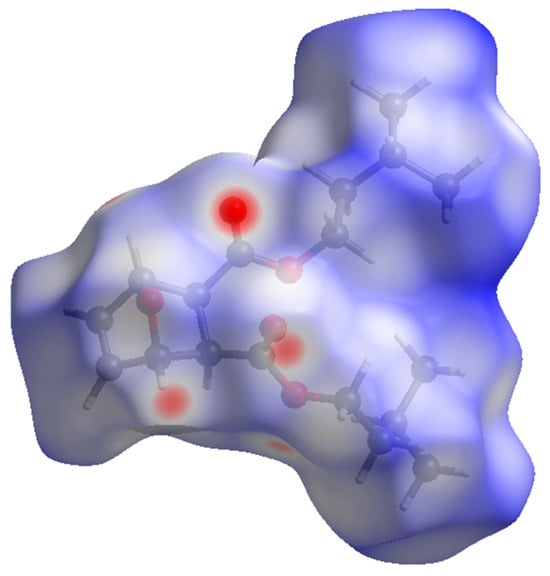 The packing of compound 2 (Figure 4) shows the molecules forming head-to-tail sheets in the a-b plane, which in turn form layers in the c-direction that are stitched together with short contacts between O3…H5–C5 and O1…H2–C2 of neighboring molecules. The intermolecular interactions of compound 2 were further investigated through a quantitative analysis of the Hirshfeld surface, visualized using the Crystal Explorer 21 software package [22]. The Hirshfeld surfaces of the molecules were mapped with the function dnorm (Figure 5). This figure color codes the contacts, with red being shorter than the sums of vdW radii, blue longer than the sums of vdW radii, and white areas approximately equal to vdW. For compound 2, the most intense red spots correspond to the intermolecular contacts between O1 and H2 [2.3029 (11) Å], and between O3 and H5 [2.4384 (11) Å]. Analysis of the two-dimensional fingerprint plot [23] indicates that H…H contacts are the most common in this structure, representing 75.2% of the intermolecular contacts. O…H contacts make the second-highest contribution, representing 21.7% of the contacts. The other types of contacts combined represent less than 10% of the contacts.