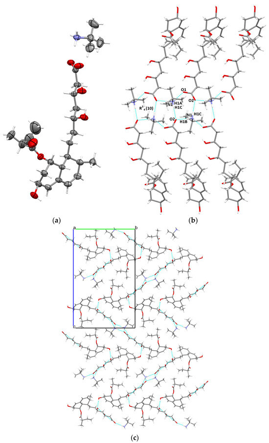 Asymmetric unit illustrating the atoms as thermal ellipsoids at a 50% probability level (a); intermolecular interactions in the crystal (b); unit cell packing along the a-axis (c).