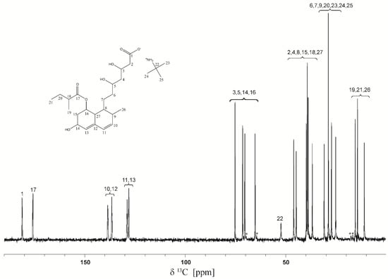 13C CP-MAS NMR spectrum of pravastatin tert-butylamine salt. The spinning side-bands are shown by asterisks. The 22–25 labels correspond to tert-butyl-amine molecules.