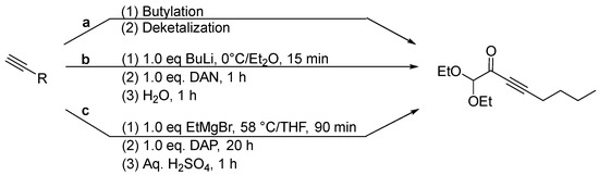 Diacetalmonoketal 2 was synthesized from 1,1-diethoxyoct-3-yn-2-one [4], which was prepared in the three different ways summarized in Scheme 1. The starting material in the first preparation was alkyne 1, which afforded 2 in 47% overall yield in a two-step synthesis involving butylation followed by deketalization (Scheme 1, route a). In the two other syntheses, the starting material was 1-hexyne, whose carbon chain could be elongated by attaching the α-ketoacetal functionality to C-1. A number of methods are available for the execution of this transformation, and we applied two, viz. the Dulou method [5] and the much older method developed by Wohl and Lange [6,7]. The former method employed 1,1-diethoxyacetonitrile (DAN) to achieve the chain extension and afforded 1,1-diethoxyoct-3-yn-2-one in 34% yield (Scheme 1, route b). When the latter was utilized and DAN was replaced by 1-(diethoxyacetyl)piperidine (DAP), however, a cleaner and much more efficient reaction took place, and the product was isolated in 78% yield (Scheme 1, route c).