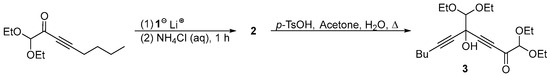 Several attempts were then made to accomplish the deacetalization and deketalization of 2 under conditions known to favor such reactions [8,9,10], with the backdrop that in addition to these reactions, the dipropargylic hydroxyl group might trigger rearrangements and also dehydration that might lead to complex reaction mixtures. It was therefore surprising to observe that when 2 was reacted with water in the presence of a catalytic amount of p-TsOH, only one transformation occurred, viz. deketalization to afford 5-diethoxymethyl-1,1-diethoxy-5-hydroxyundeca-3,6-diyn-2-one (3). At best, 3 was isolated in 60% yield (Scheme 2).