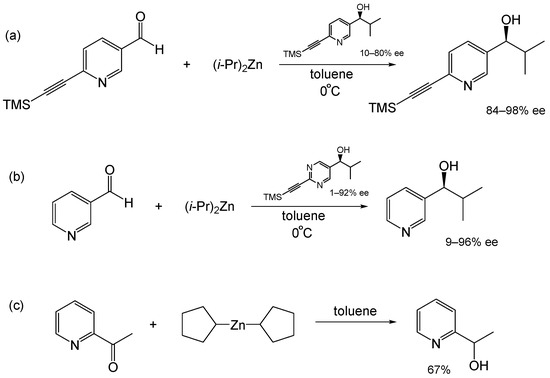 - Bauer, T. Enantioselective dialkylzinc-mediated alkynylation, arylation and alkenylation of carbonyl groups. Coord. Chem. Rev. 2015, 299, 83–150. [Google Scholar] [CrossRef]